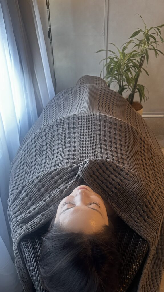 木の葉型のベッドに寝ていただき、お身体の上をドーム状に囲う事で、全身の蒸気浴ができる施術です🌿✨